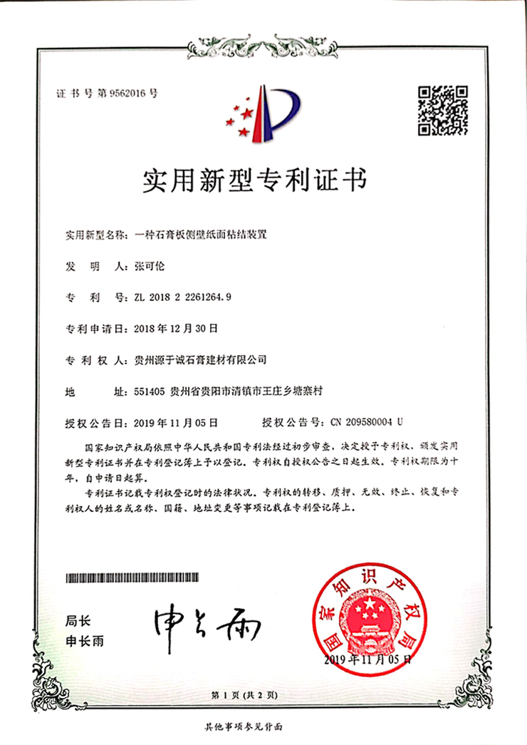 專利證書(一種多功能紙面石膏板生產(chǎn)裝置)